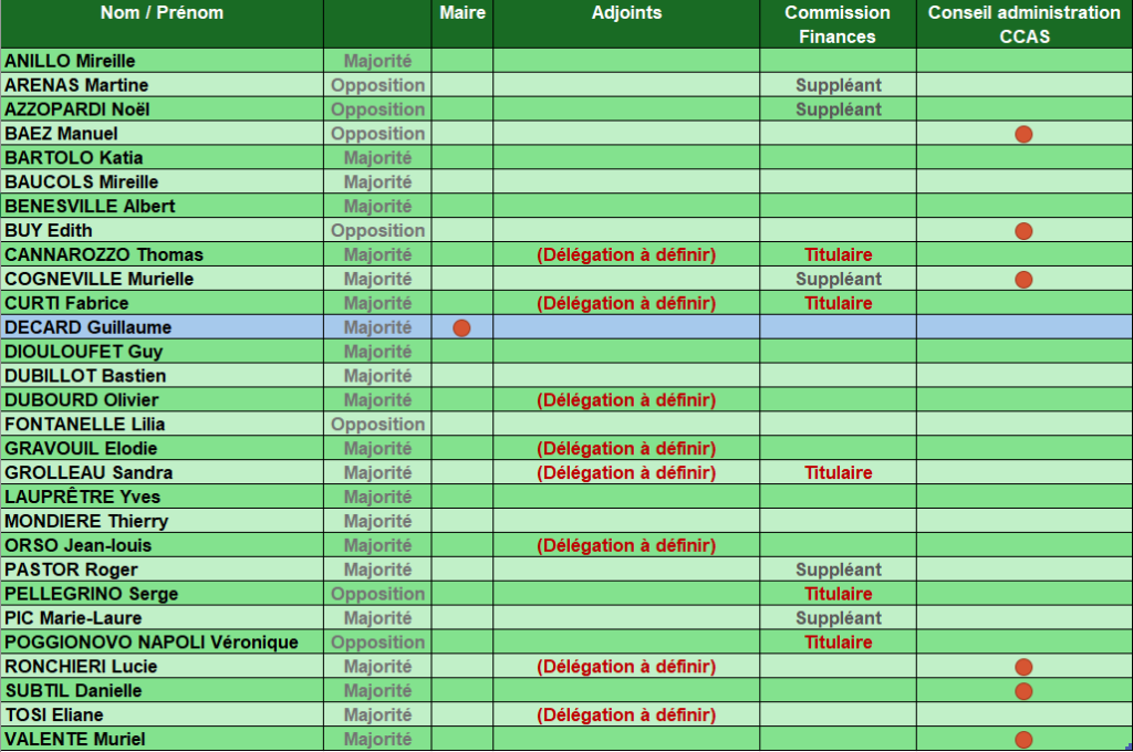 Ci-dessous un tableau récapitulatif de l’ensemble de l’équipe municipale avec leurs rôles. Ce tableau sera mis à jour lorsque les affectations des adjoints seront connues.