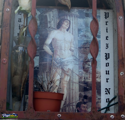 L’oratoire contient une plaque émaillée représentant le martyre de Saint-Sébastien, inspirée d’un tableau célèbre d’Andrea Mantegna (vers 1480, conservé au Louvre) :